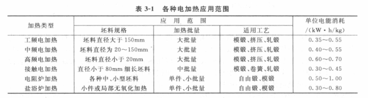 感應(yīng)加熱優(yōu)點(diǎn):加熱速度快,加熱質(zhì)量好,不用保護(hù)氣氛也可實(shí)現(xiàn)少氧化加熱(燒損率一般<0.5%),感應(yīng)加熱規(guī)范穩(wěn)定,勞動條件好,對環(huán)境無污染,便于機(jī)械化、自動化操作,宜裝在生產(chǎn)線上,實(shí)現(xiàn)在線加熱。其缺點(diǎn)是:設(shè)備投資大,耗電量大,一種規(guī)格感應(yīng)器所能加熱的坯料尺寸范圍窄。上述各種電加熱方法的應(yīng)用范圍見表3-1。